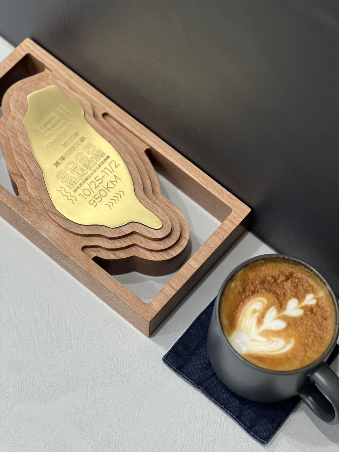 以「環島」為核心設計概念,運用木頭材質結合激光雕刻工藝,低調卻展現高級質感,而多層次的台灣輪廓象徵騎士們的足跡與地形挑戰,不僅是一座獎座,更是汗水與意志的具象化。